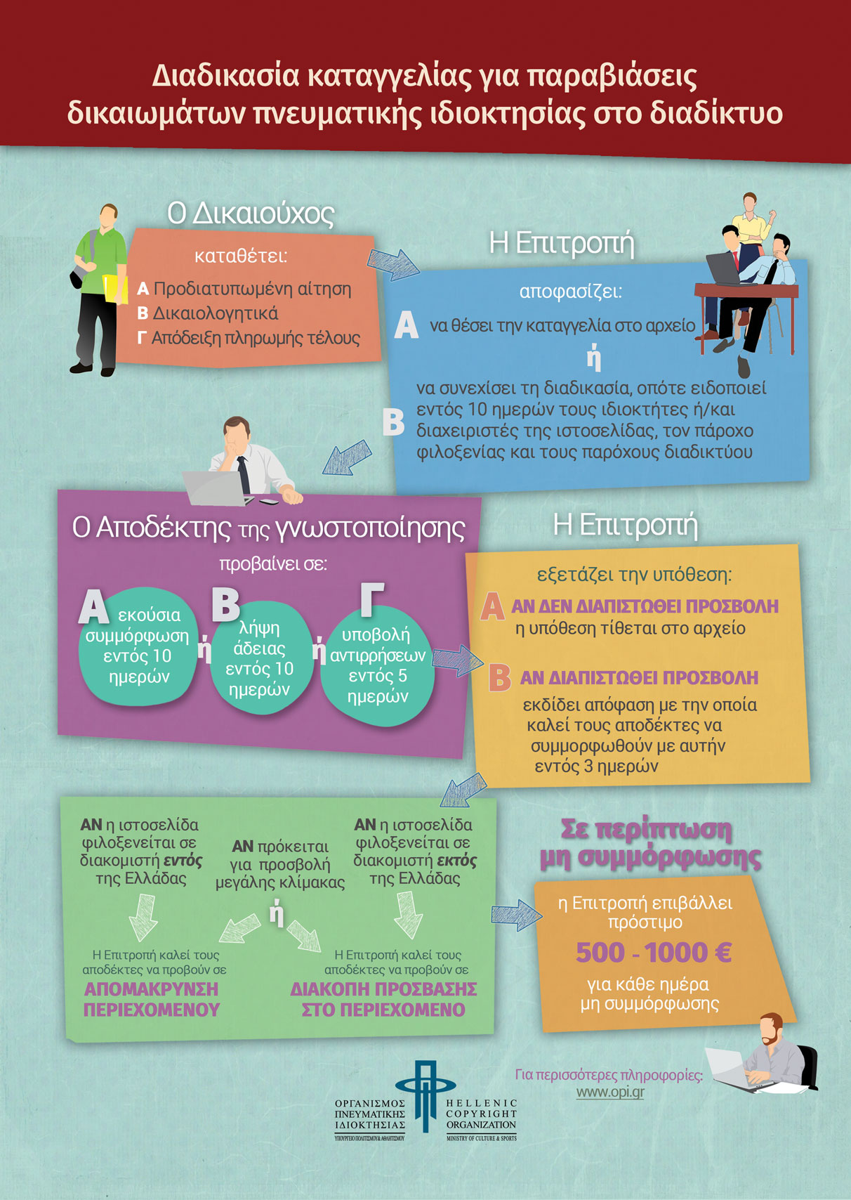 Οι δικαιούχοι μπορούν να υποβάλλουν αίτηση στην Επιτροπή σε κάθε περίπτωση προσβολής δικαιωμάτων πνευματικής ιδιοκτησίας ή/και συγγενικών δικαιωμάτων στο διαδίκτυο υπό τον όρο της πλήρωσης των προϋποθέσεων που προβλέπονται στο άρθρο 66Ε του ν. 2121/1993.